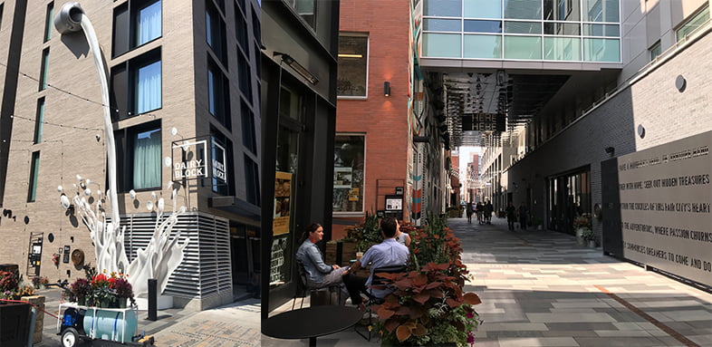 Our second top urban public space is the new Dairy Block. The designers converted an alleyway into a lively place connecting residential, retail and restaurants. Dairy Block rated high in safety, seating, cleanliness, seasonal use (good all year round), materiality, and versatility.