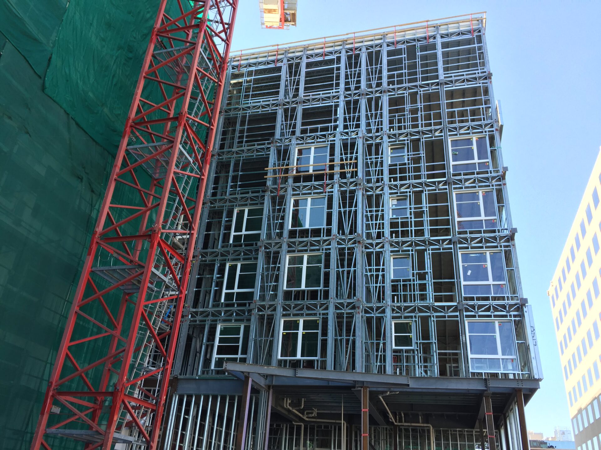 One approach, particularly used for clients interested in high-rise design, is the use of metal stud panels. Light gauge steel walls are fabricated offsite, then later transported and assembled onsite. Remote panelization allows manufacturers to build the walls in a controlled environment with steady labor, reducing the time spent on site while simultaneously improving the quality and accuracy of the individual component. The faster construction also reduces the cost of financing and some of the risk associated with development.
