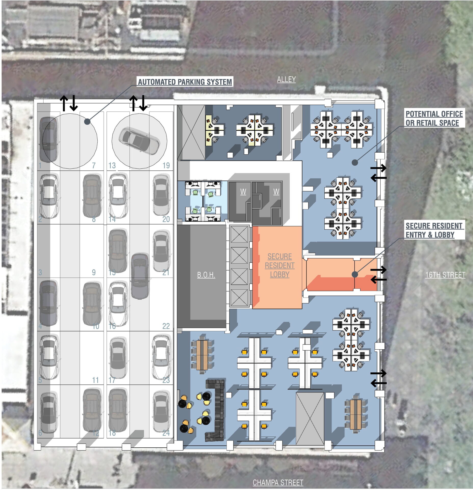 To address the need for parking, we converted the adjacent lot into an automated parking system that can store up to 24 cars per level. This space can serve as short-term parking for those who need regular access to their vehicle, or longer-term storage for those who want to keep their vehicle, but do not drive often.