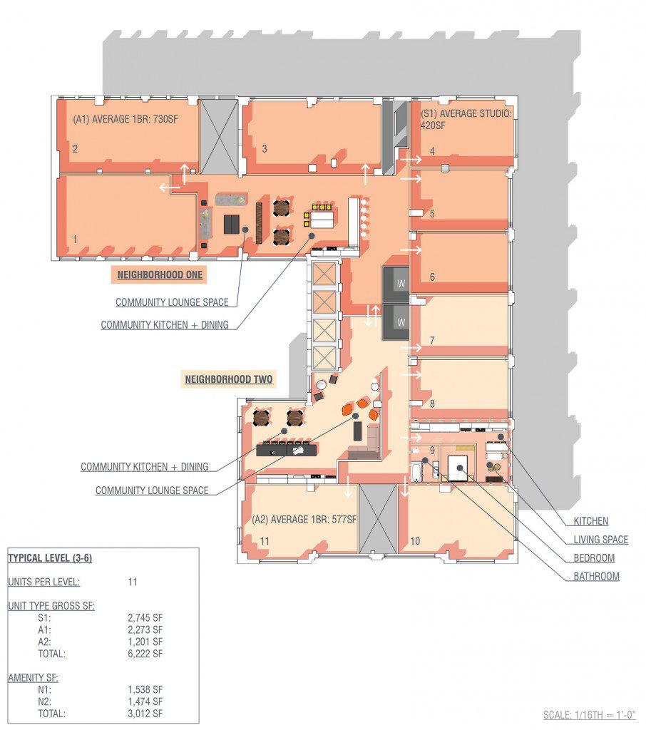We have reprogrammed floors 3-12 for 100% residential use. Each floor contains two neighborhoods with a mix of studio and one-bedroom units, as well as a communal space with a kitchen and lounge area. The neighborhood design is intended to help foster connection and community by providing comfortable, intimate spaces for residents to gather. This is a departure from the programming typically found in large apartment buildings, where shared amenity spaces are used by everyone and it can become more difficult to thoughtfully connect with neighbors. Right-sizing the amenity spaces for smaller groups and conveniently situating them at the heart of each neighborhood allows neighbors to easily come together to cook a meal, play a game or stream a favorite show together. Neighborhoods could be themed to further attract individuals with shared interests.