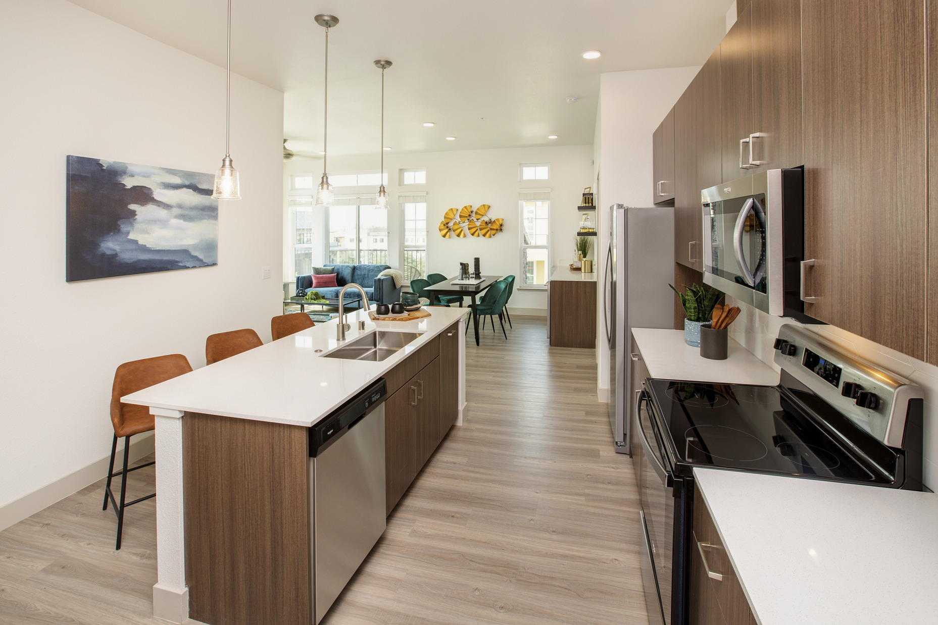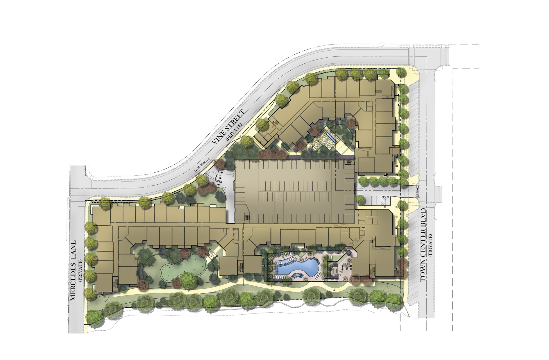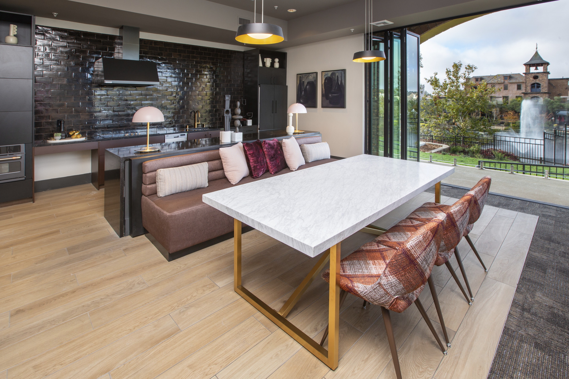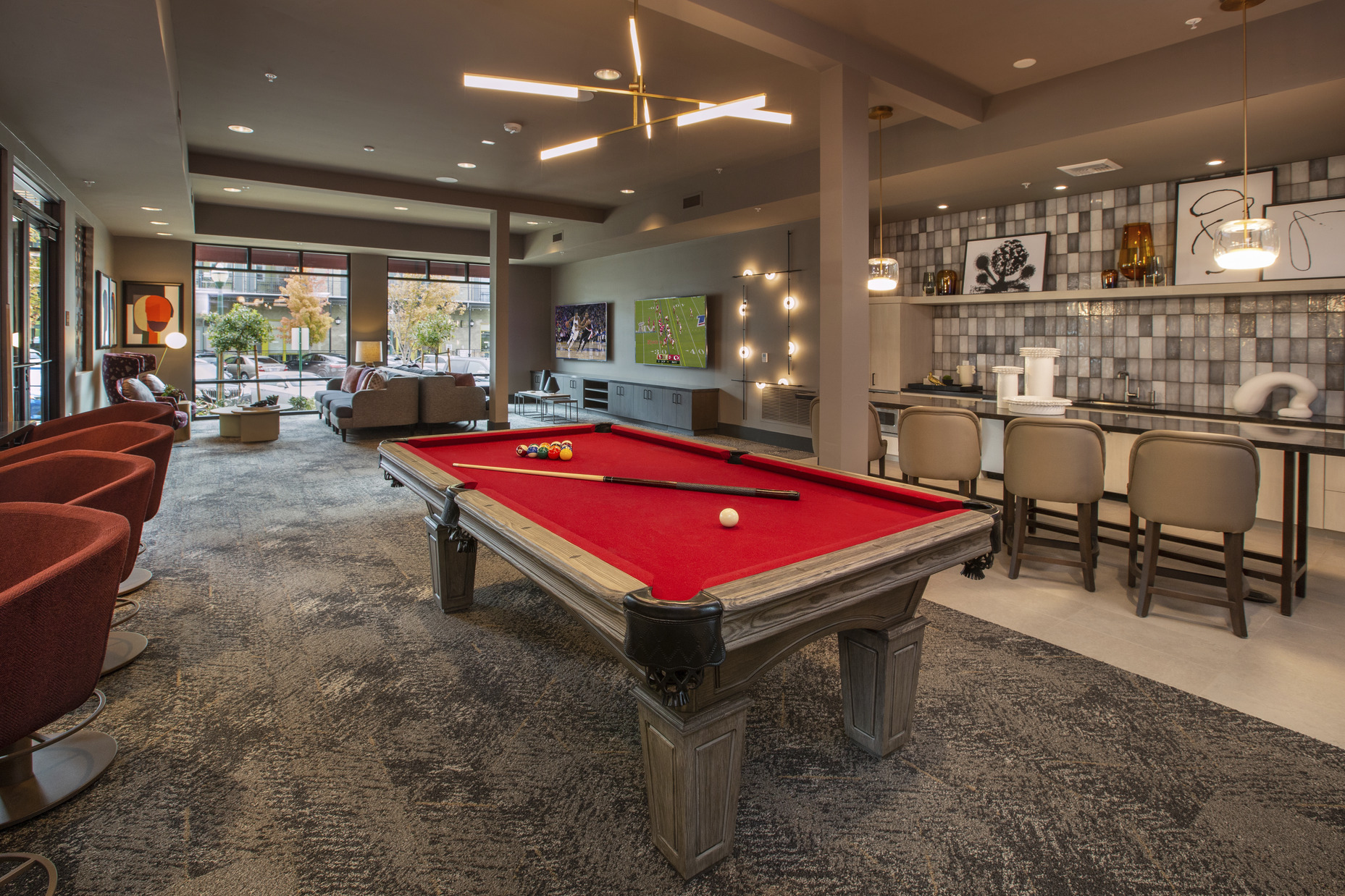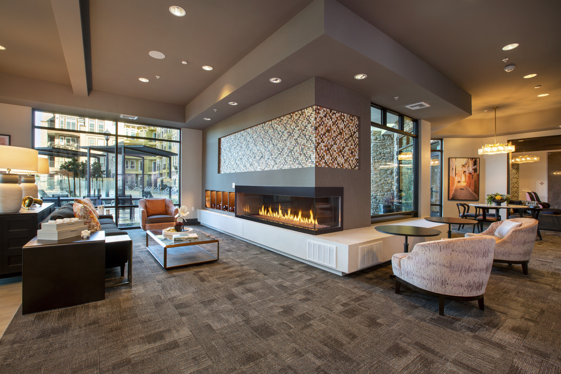 The goal was to design a community that doesn’t demand attention, but rather serves as the perfect backdrop for everyday life and evokes feelings of inclusion and connection from residents and visitors. To do so, we activated the streetscape by locating all amenities on the first floor and facing them outward, including a state-of-the-art fitness center and wellness studio, a wine lounge, and a 1,000 sf co-working space. We used timeless design and materiality to fit within the old-world styling of the master plan, and keeping with the Italian Palazzo-style used stucco wraps and chimneys to mask the mechanical and electrical elements. The elegant, yet understated design adds charm and brings new life to the experience of visiting the Town Center.