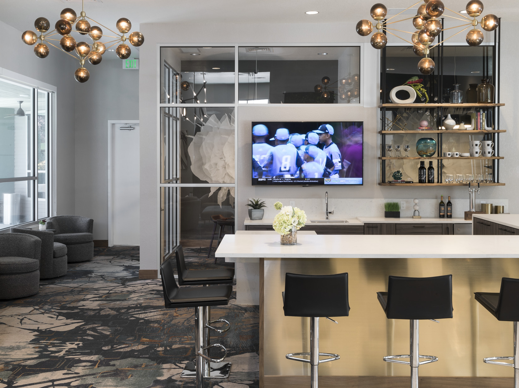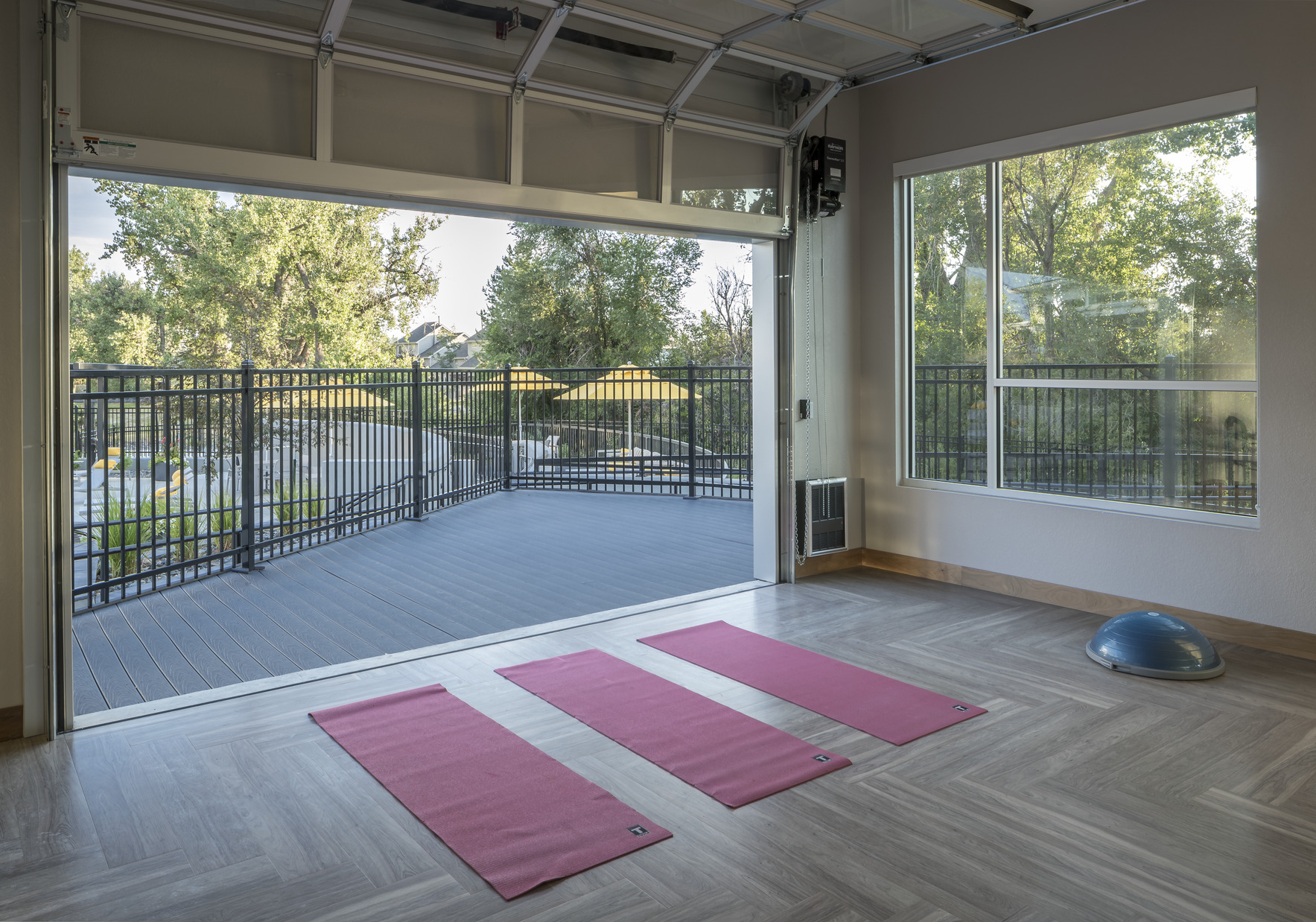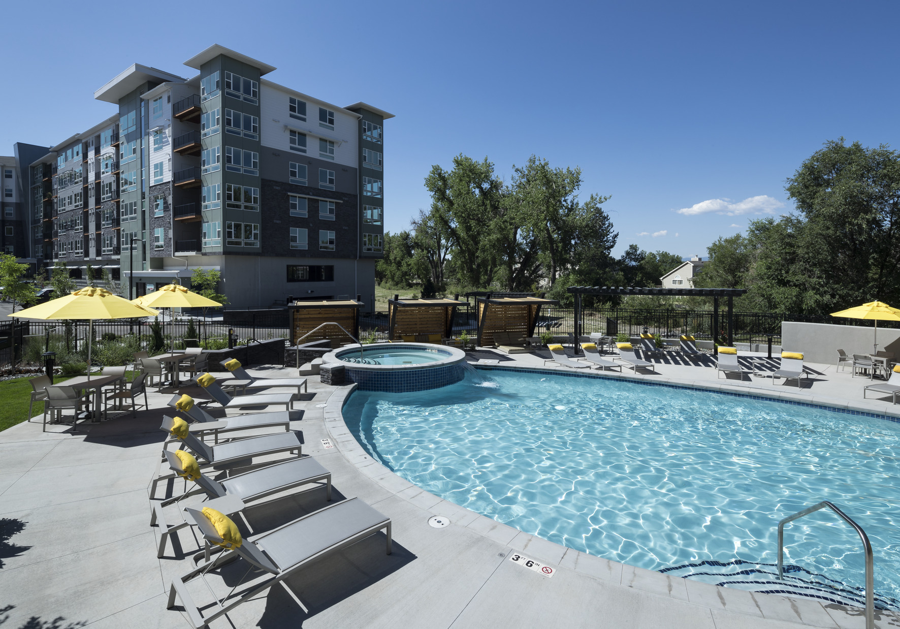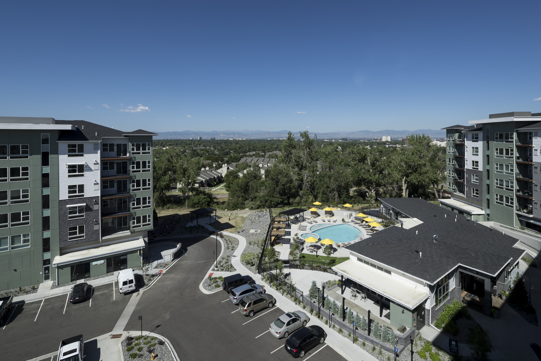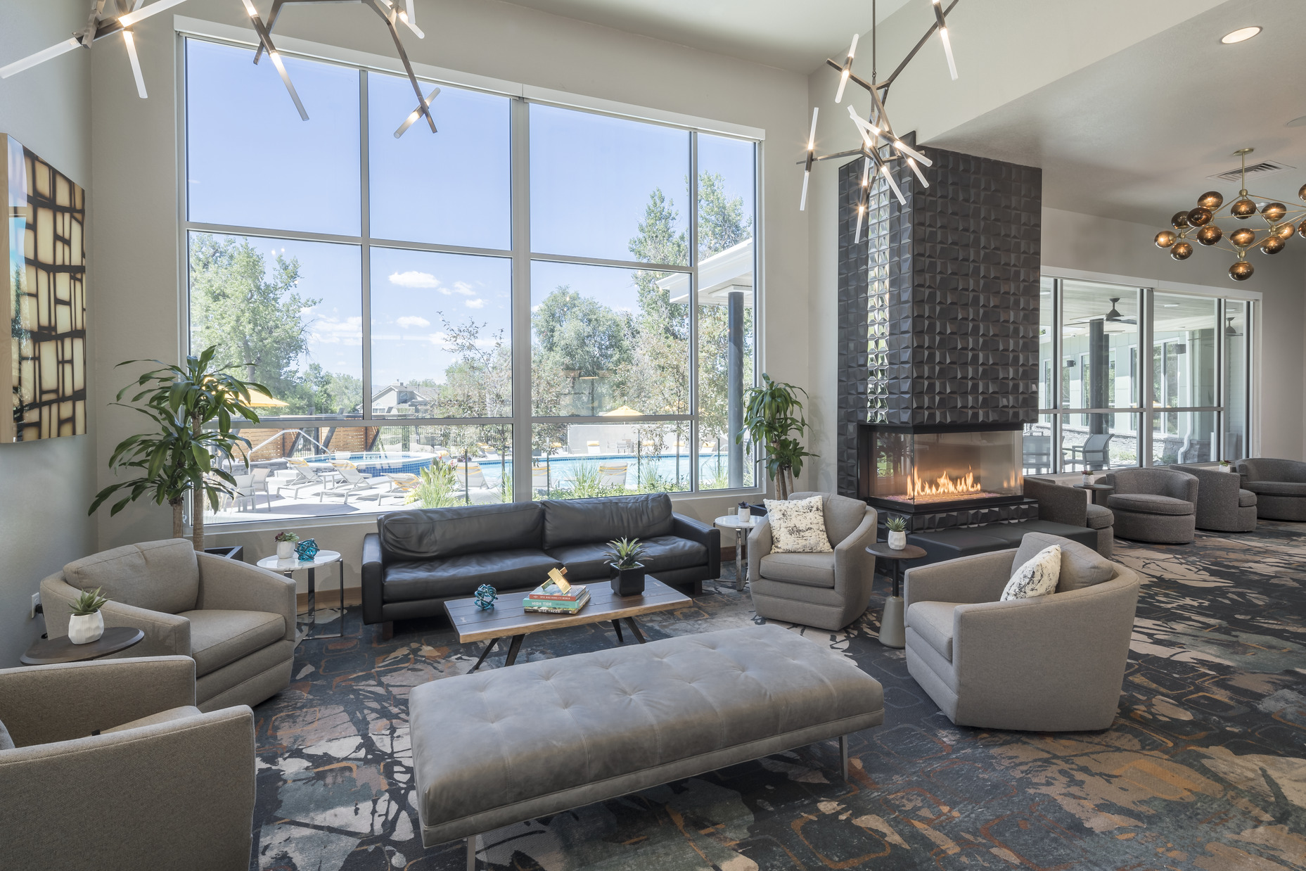 The two buildings at High Line Pointe were thoughtfully oriented to take advantage of mountain and front range views and provide convenient access to the High Line Canal Recreational Trail. A focus on fitness and an active lifestyle were the key drivers when designing the amenities. Preserving the existing trees was a priority to connect the community to the surrounding neighborhood and provide a sense of place. Amenities includes a layered pool and oversized pool deck with private cabanas give the multifamily community a resort like feel, a fitness center and yoga studio that open to the pool deck, and a clubroom with full bar and seating.