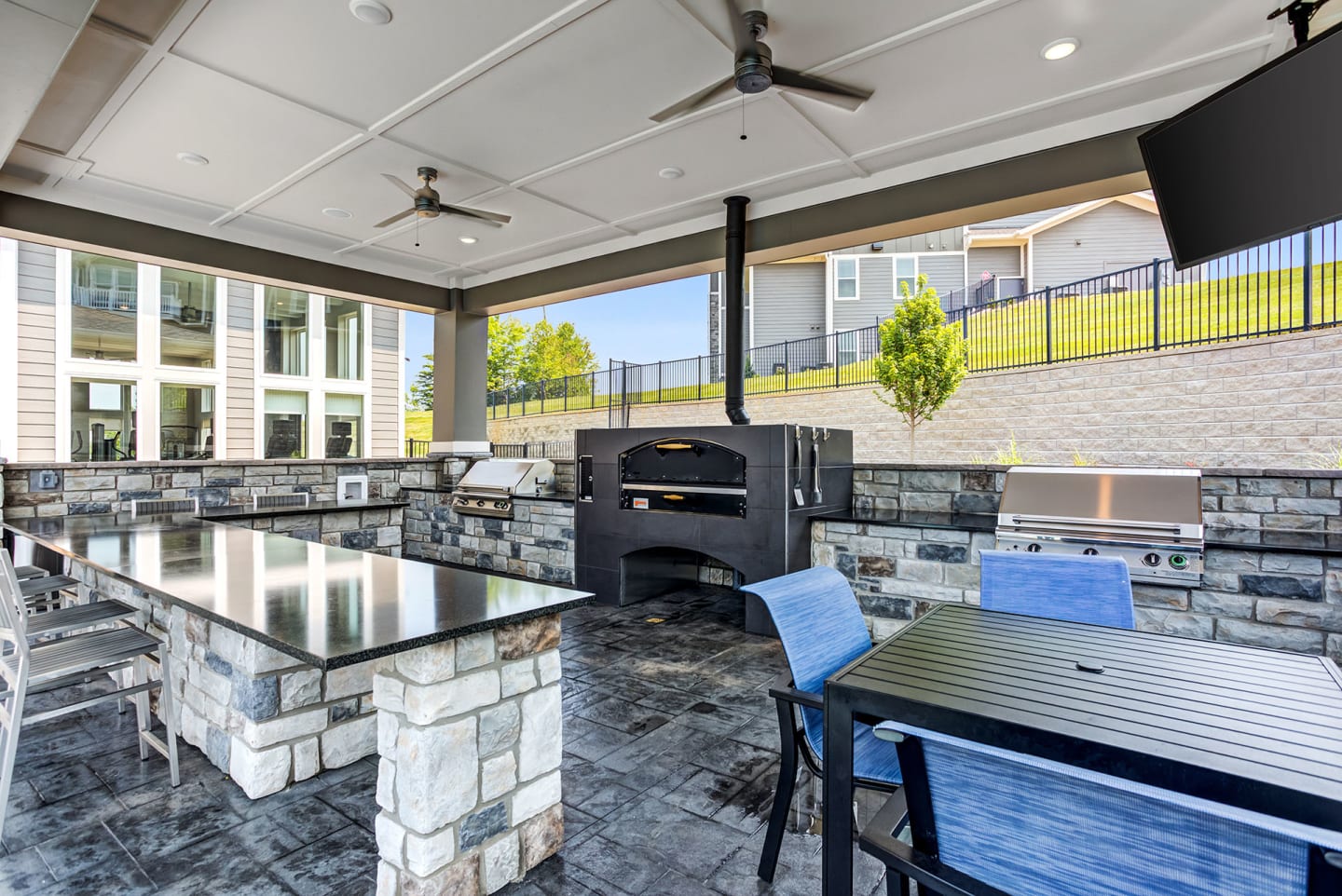 cabanas, outdoor kitchen with pizza oven, large fitness center, business center, dog park and sports
