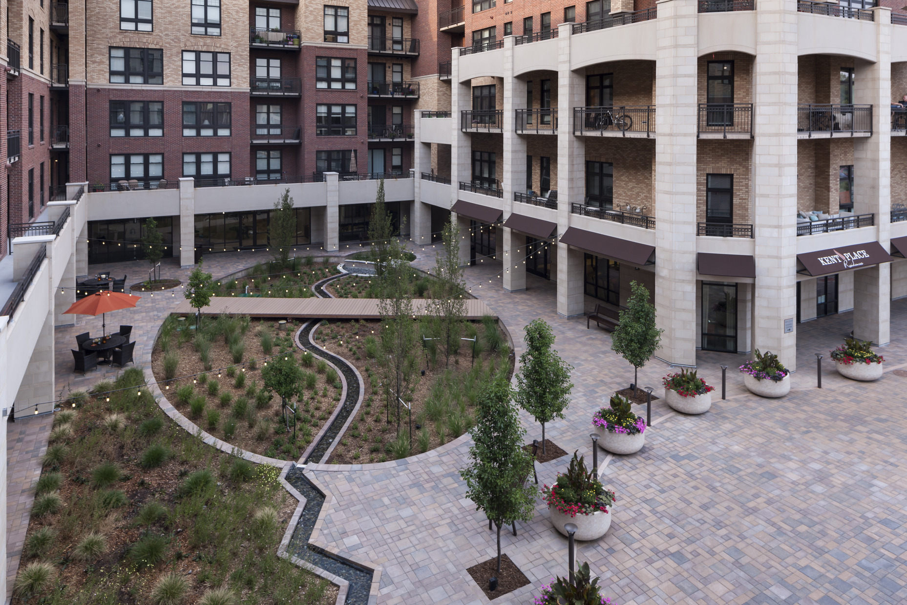 For Kent Place to appeal to the renter-by-choice demographic, the community has a classic traditional architecture style. The design takes its cues from the adjacent multi-million dollar homes and the timeless structures on the nearby University of Denver campus. Kent Place is covered in materials including limestone block and brick in a variety of patterns and colors. This seamlessly ties the large buildings into the neighborhood. At the important corners, rich detailing, turrets, and tower forms break-up the massing while creating architectural distinction.