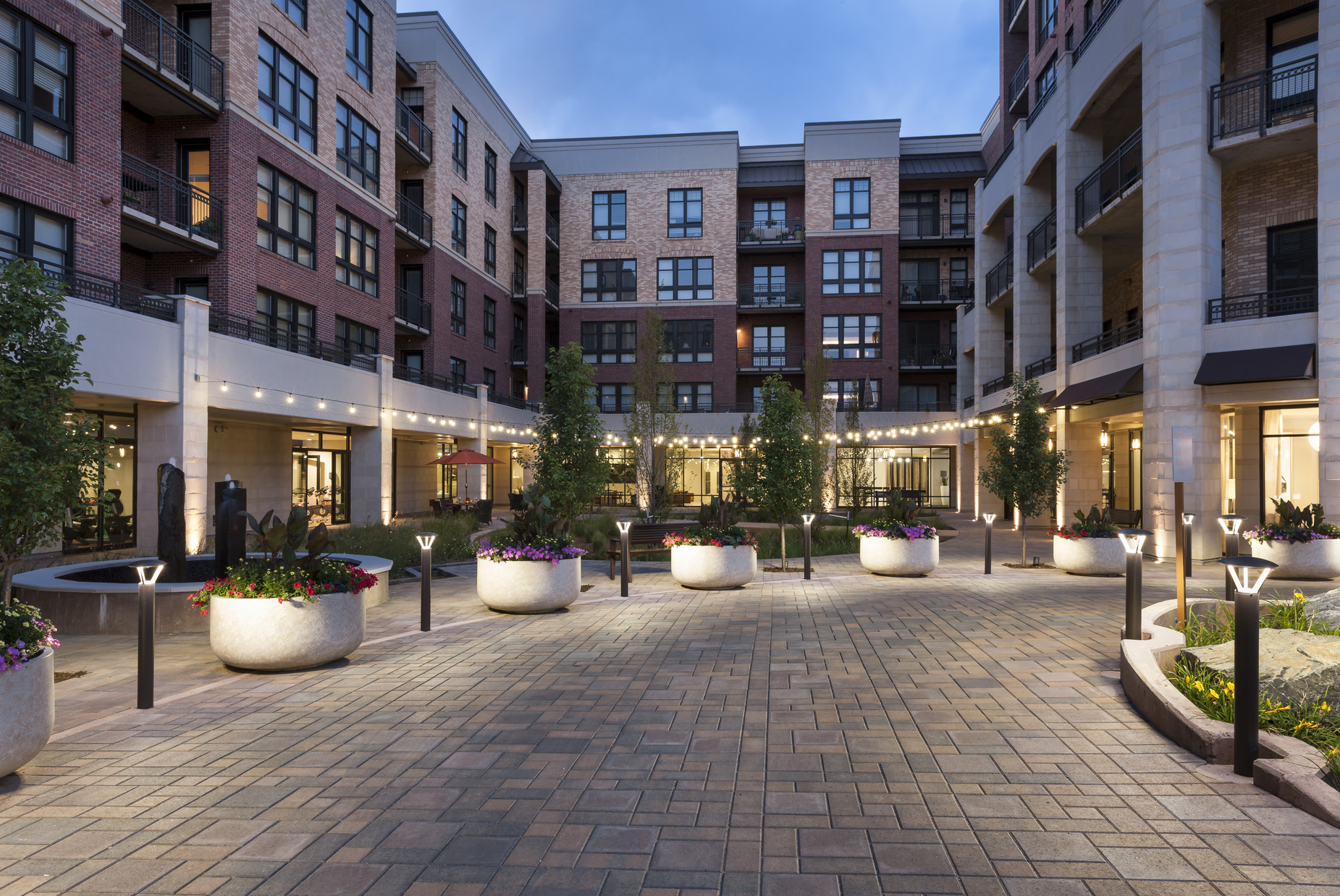 Instead of activating the busy corner of the community with the leasing, we placed those items in the center of the building to connect the residences and retail to create a walkable and pedestrian friendly urban village. We designed a piazza to draw people into the center of the community. The piazza with lush landscaping, fountains and Tivoli lighting creates a seamless transition between public and private space. All the while giving the community a signature statement and unique sense of arrival.