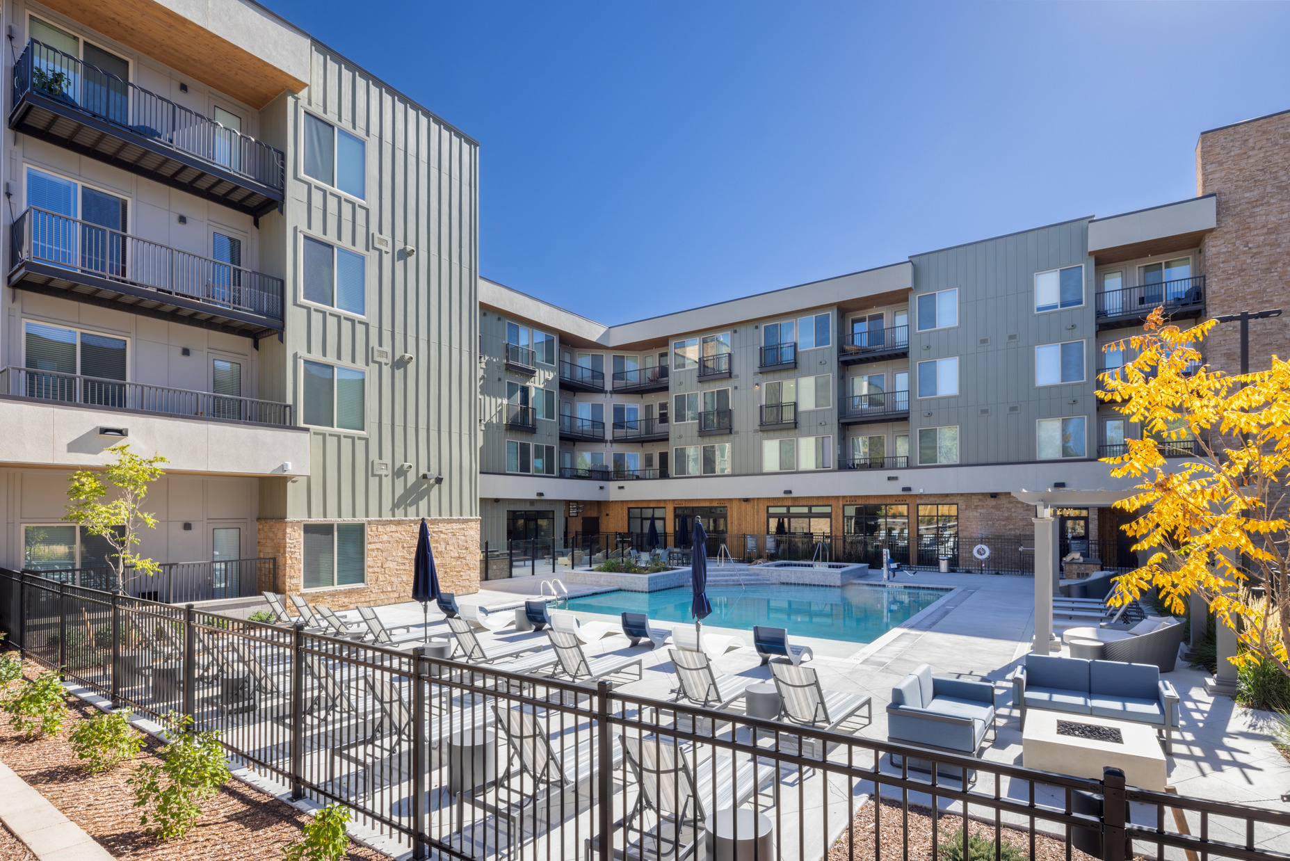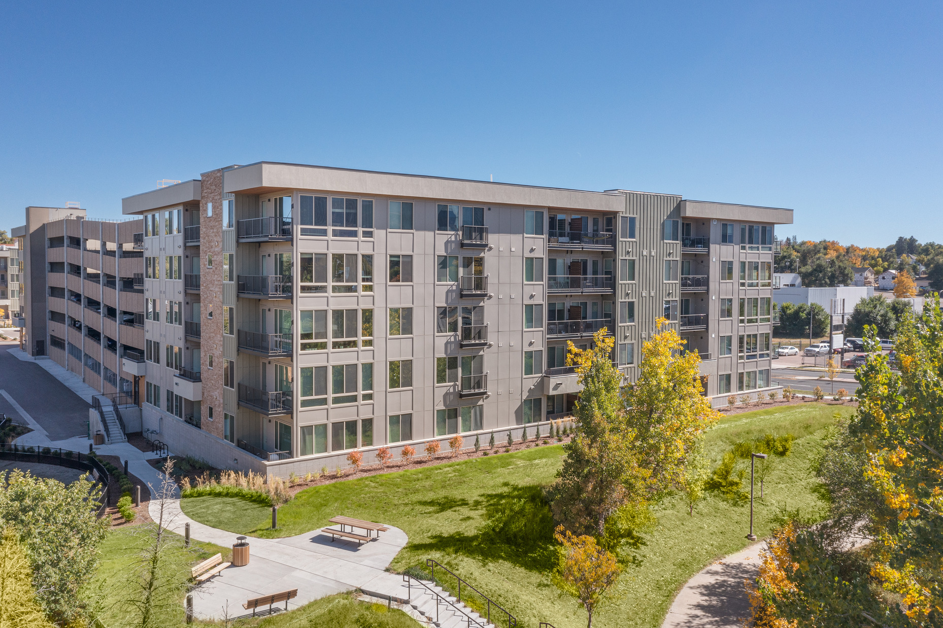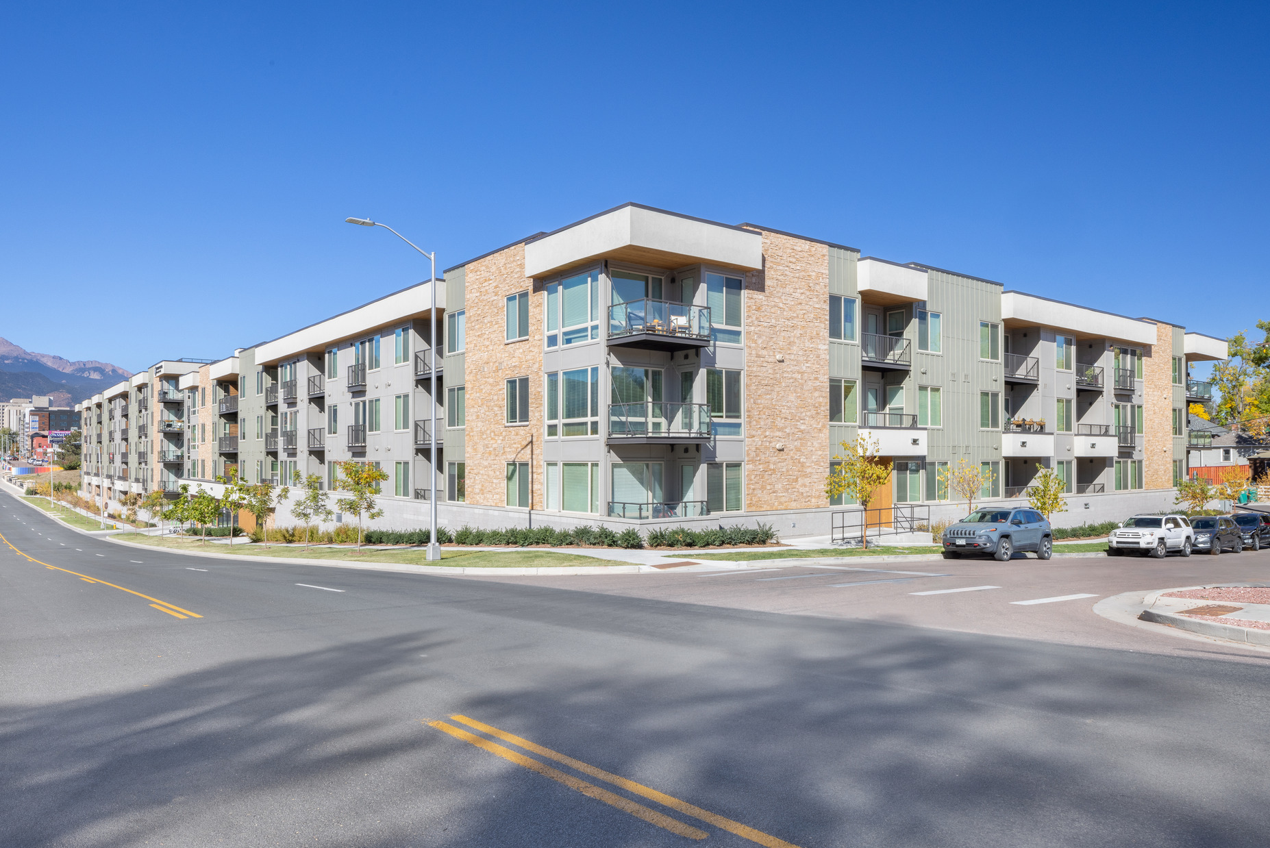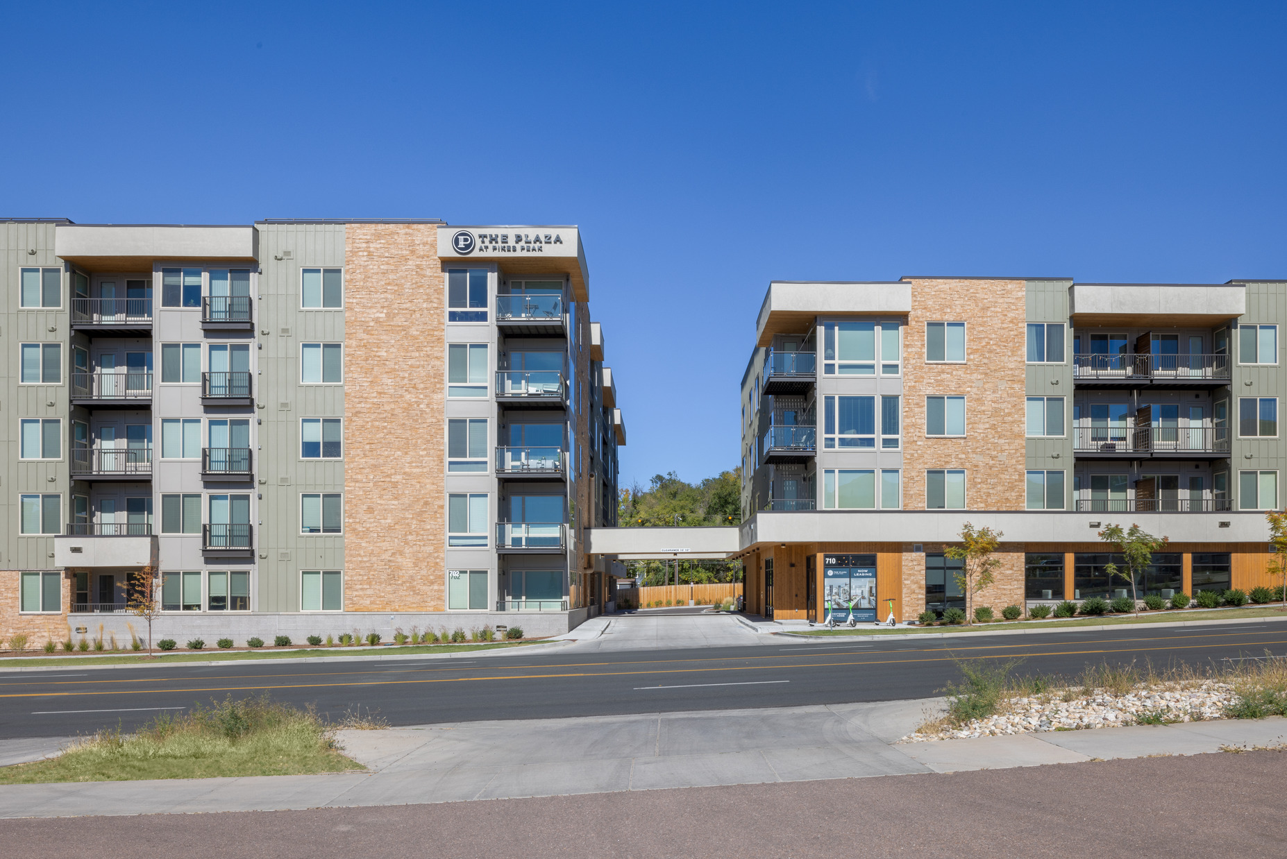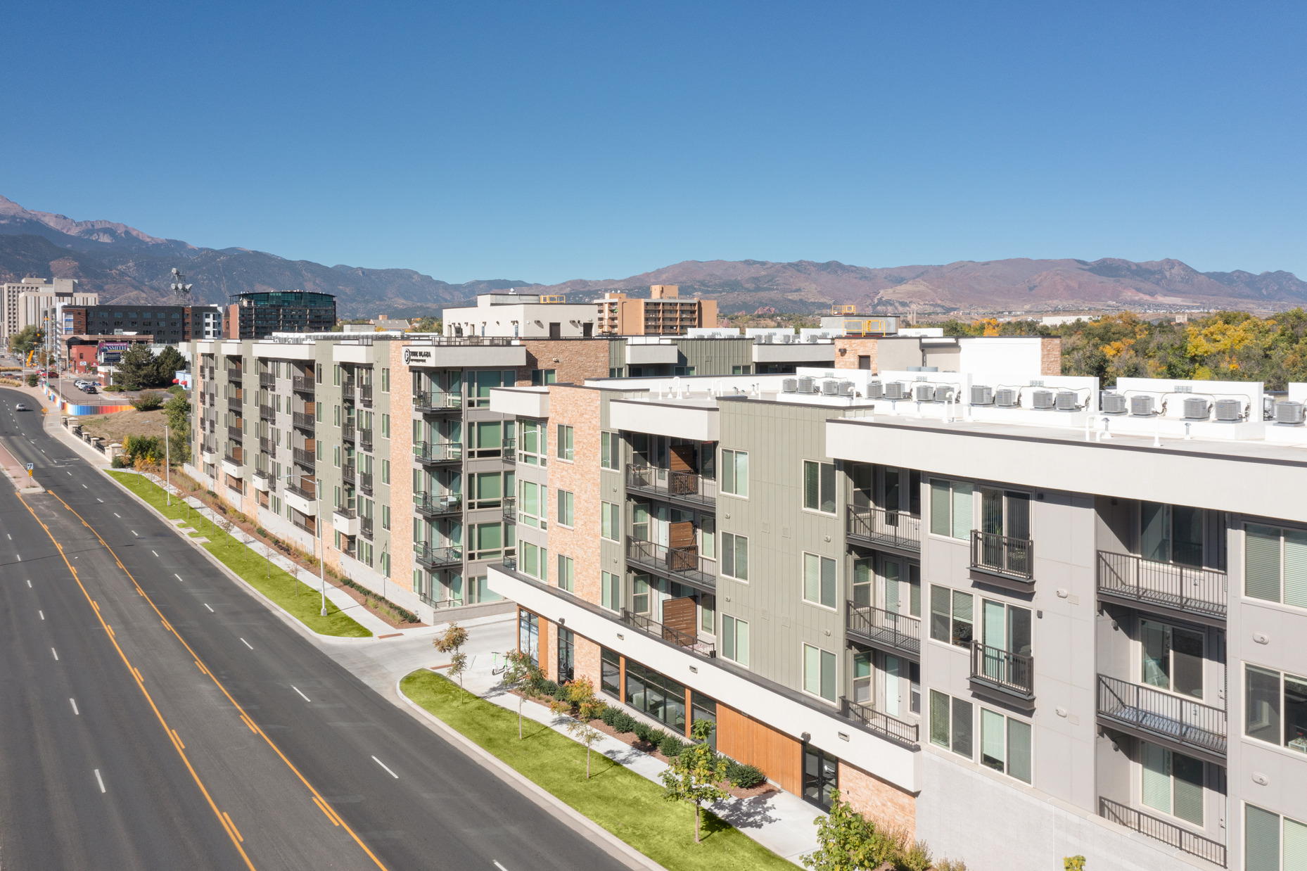 Designed for young professionals in the heart of downtown Colorado Springs, Pikes Peak Plaza is one of the first apartment communities of its kind in the area and sets the stage for future development. This 215-unit, mixed-use community will appeal to visitors and locals alike, with more than 8,000 sf of retail space and luxury amenities including a pool, outdoor lounge, and a rooftop deck with panoramic views of the surrounding mountains.