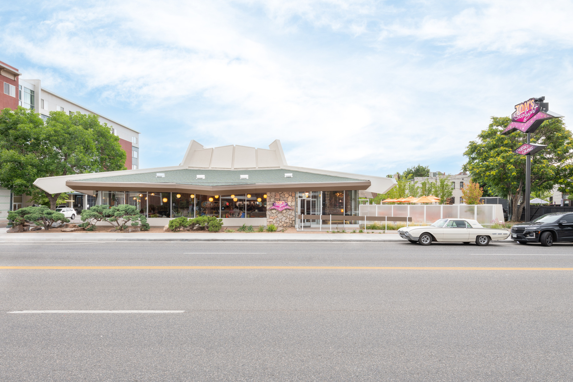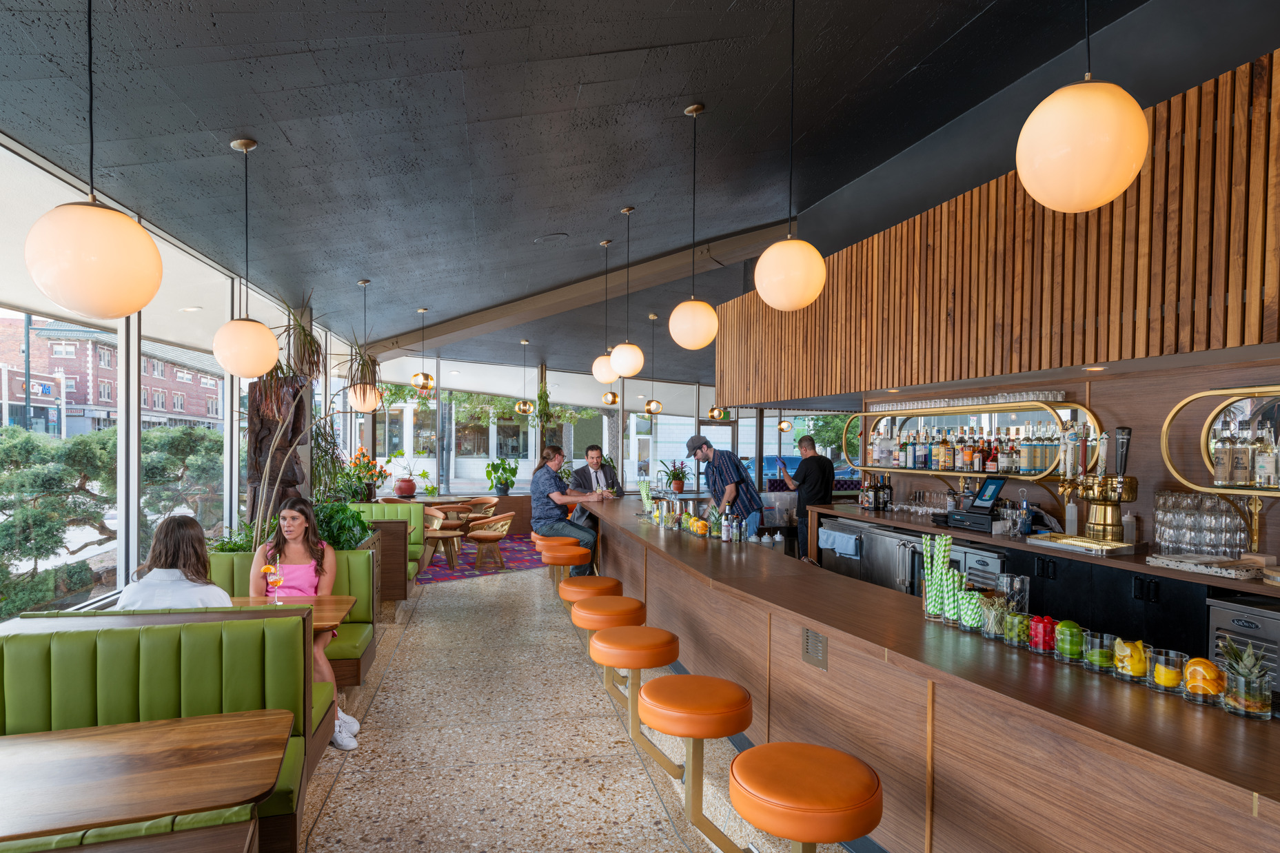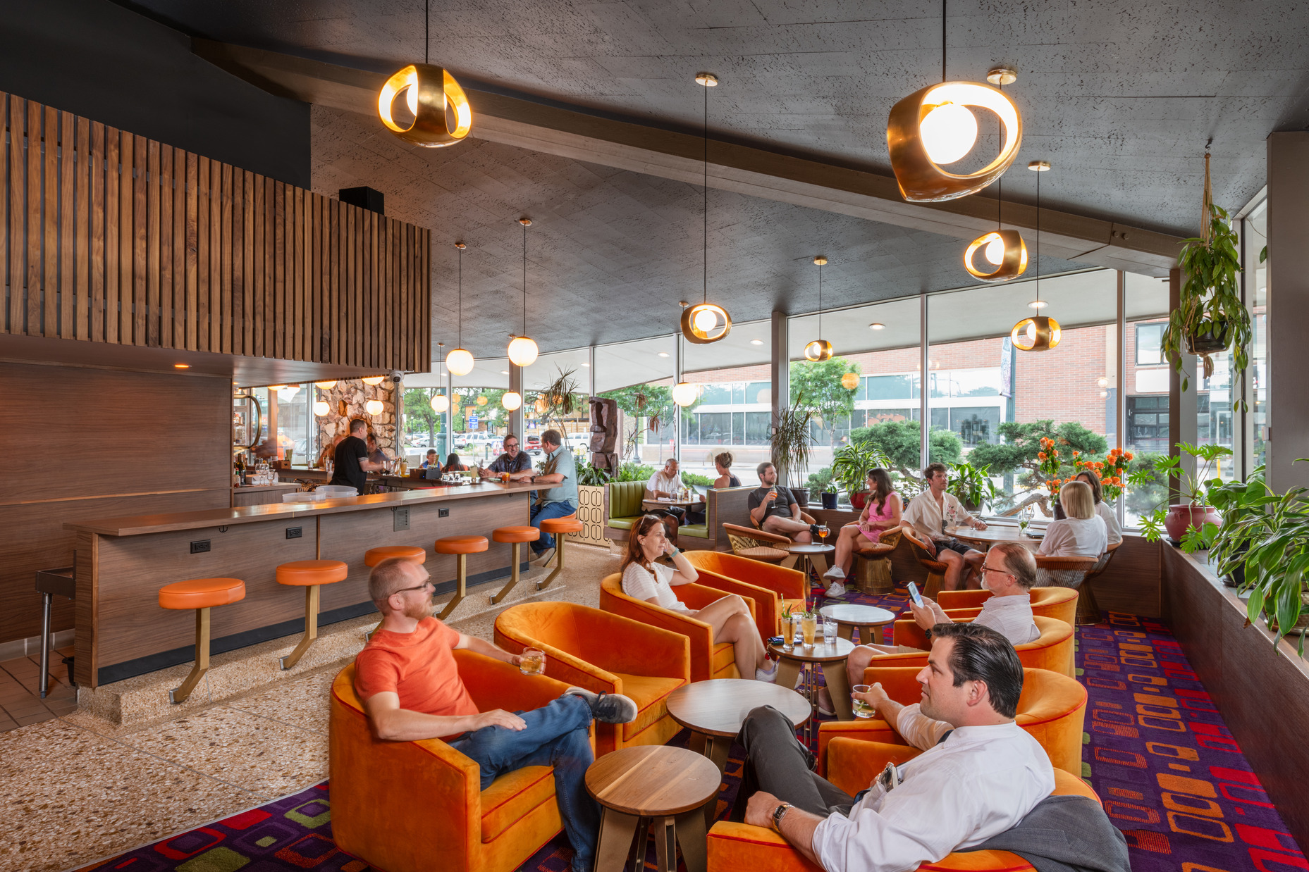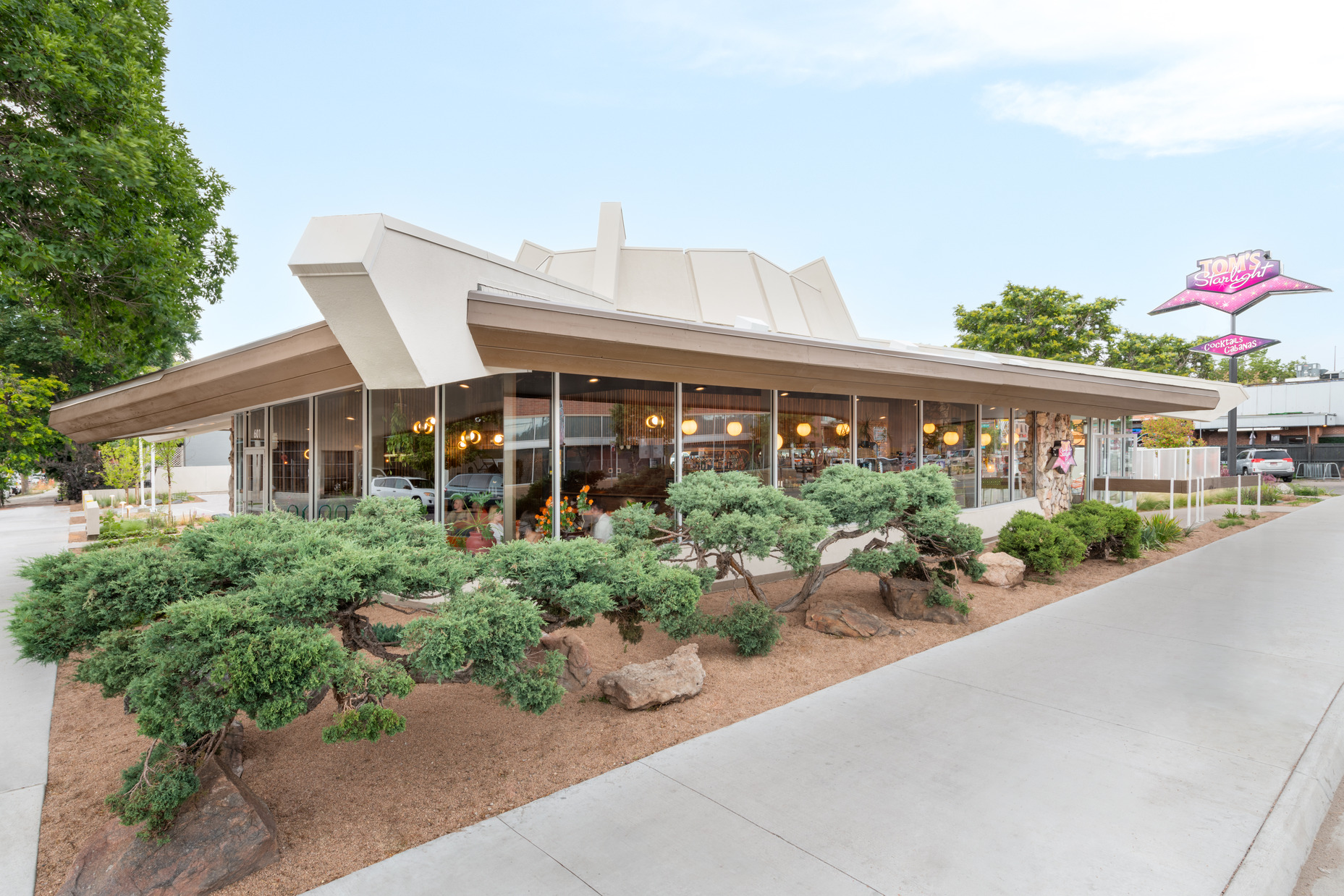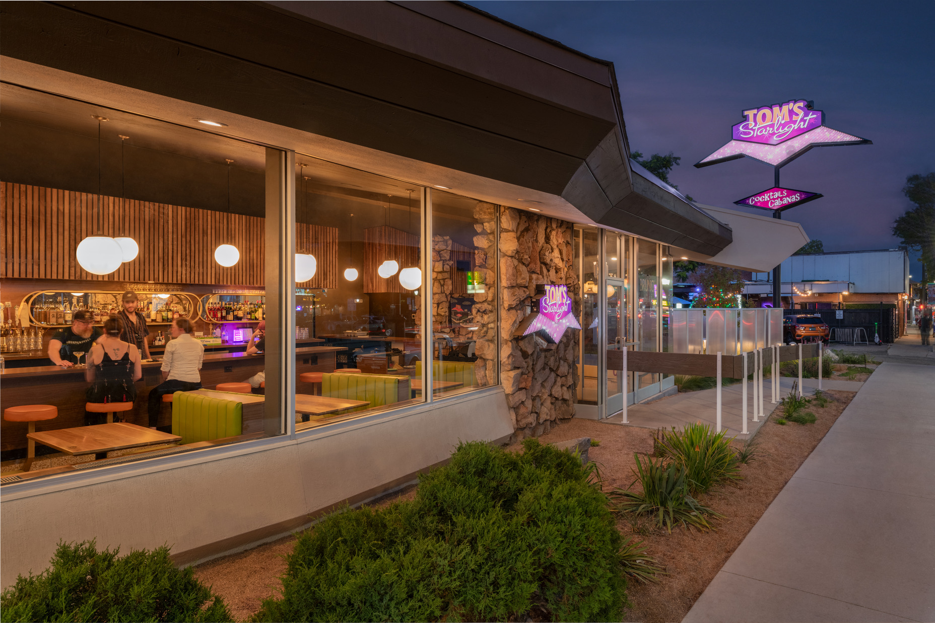 The vision was to transform a tired, 24/7 diner into a modern cocktail lounge with a 1960’s era Palm Springs vibe. This started with revitalizing the historic structure and building upon the original Googie-style design crafted by nationally recognized architects, Armet and Davis in 1967. Inside, the terrazzo floors were kept along with the acoustic tile ceiling and the stone veneer planters. The kitchen was closed from public view and clad with walnut paneling and open shelving reimagining the old dining counter as an active bar. Outside, the parking lot was transformed into an outdoor oasis with semi-private cabanas, fire pits, fountains, a large lawn, and a seating area that can flex into a stage for musical performances to create a variety of experiences and spaces that are made for today, while honoring the past.