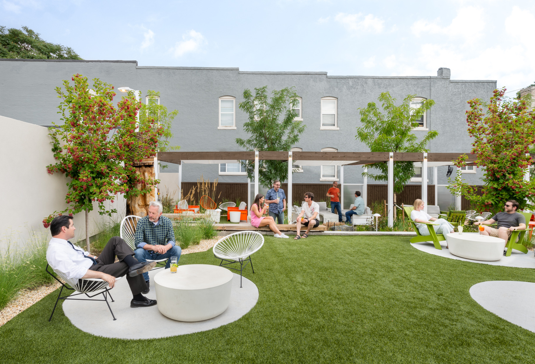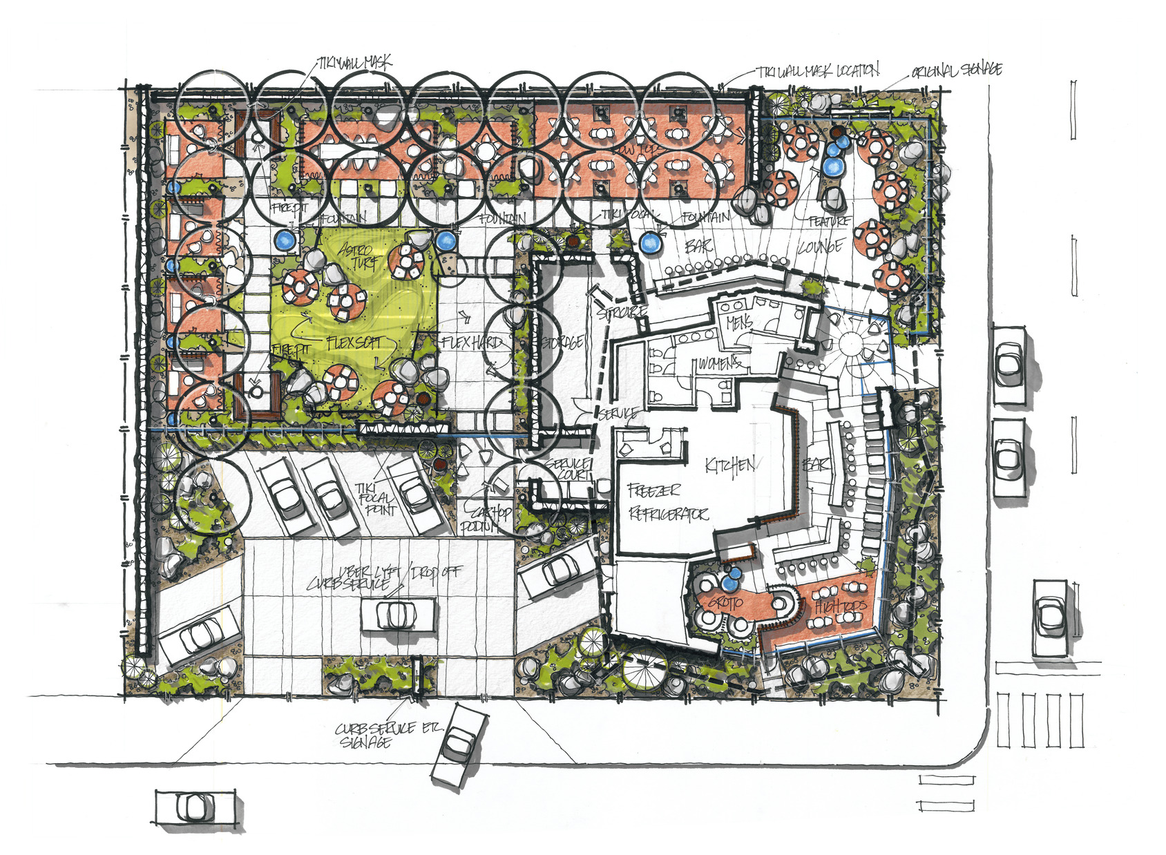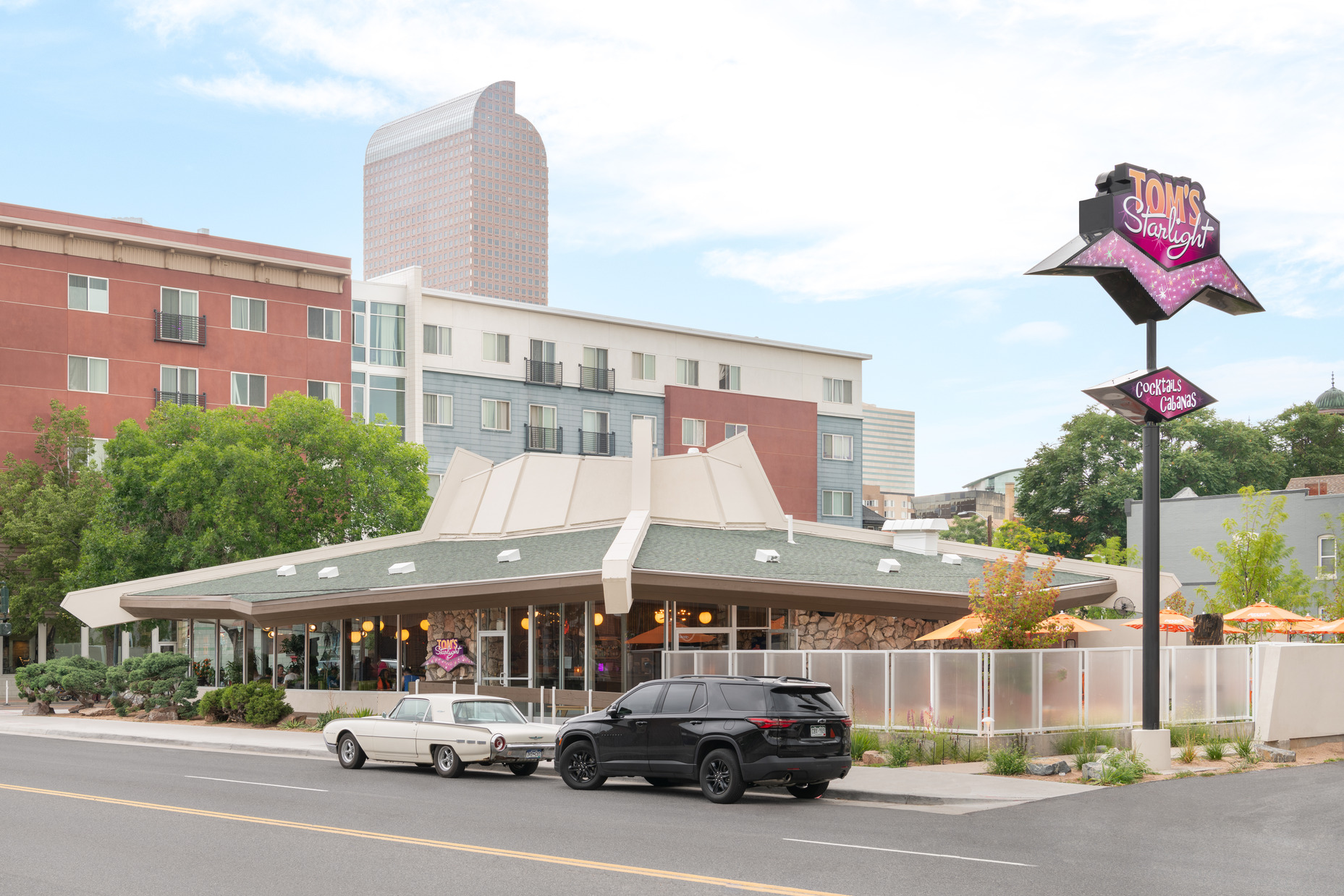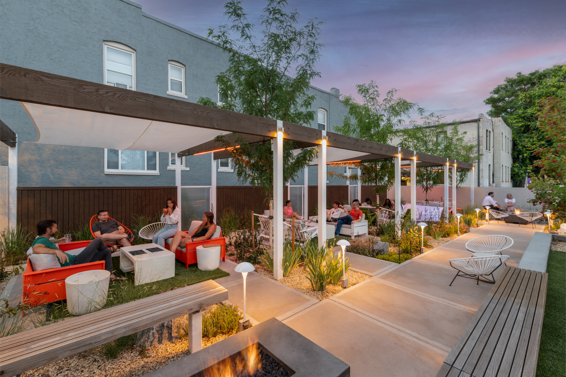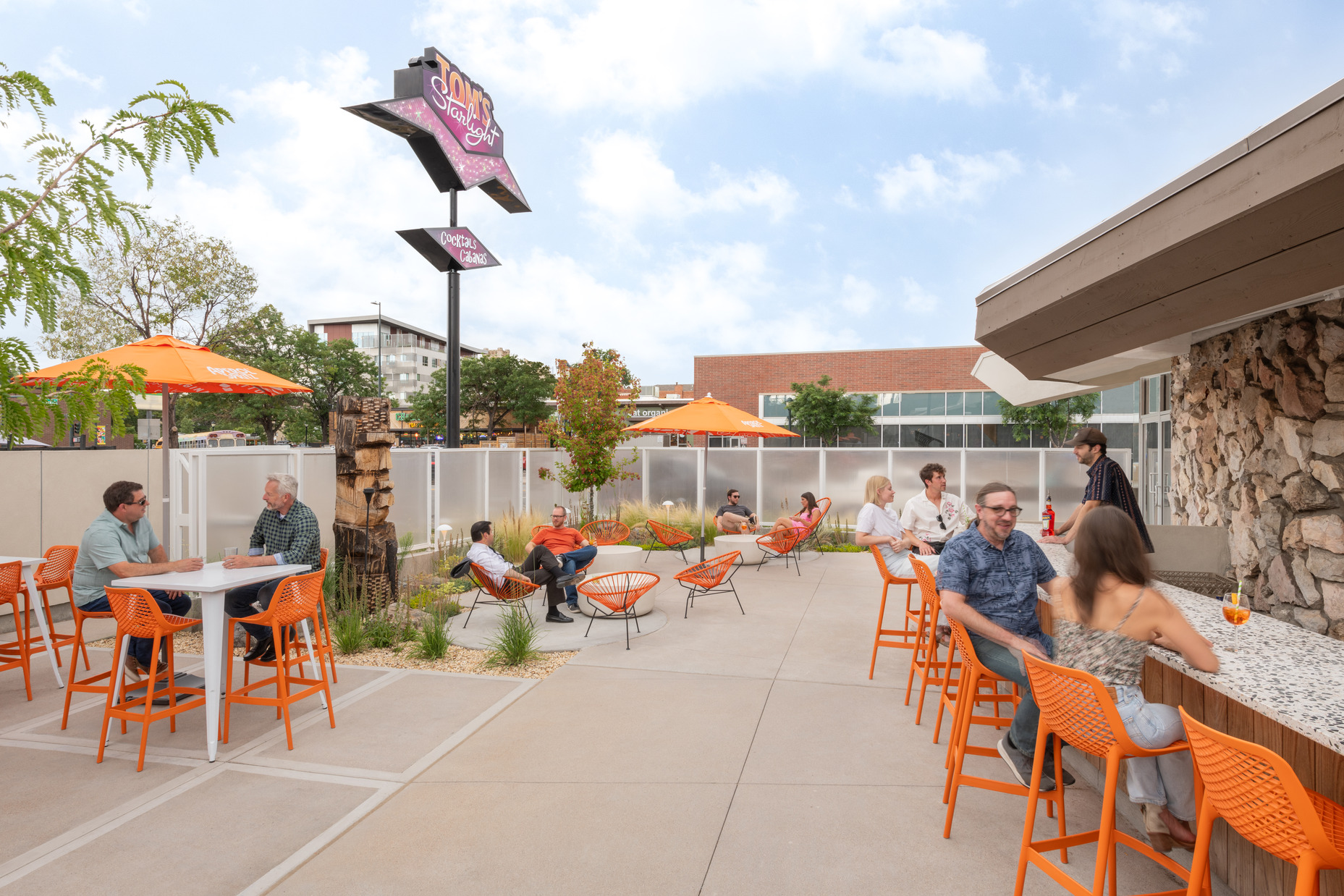The vision was to transform a tired, 24/7 diner into a modern cocktail lounge with a 1960’s era Palm Springs vibe. This started with revitalizing the historic structure and building upon the original Googie-style design crafted by nationally recognized architects, Armet and Davis in 1967. Inside, the terrazzo floors were kept along with the acoustic tile ceiling and the stone veneer planters. The kitchen was closed from public view and clad with walnut paneling and open shelving reimagining the old dining counter as an active bar. Outside, the parking lot was transformed into an outdoor oasis with semi-private cabanas, fire pits, fountains, a large lawn, and a seating area that can flex into a stage for musical performances to create a variety of experiences and spaces that are made for today, while honoring the past.