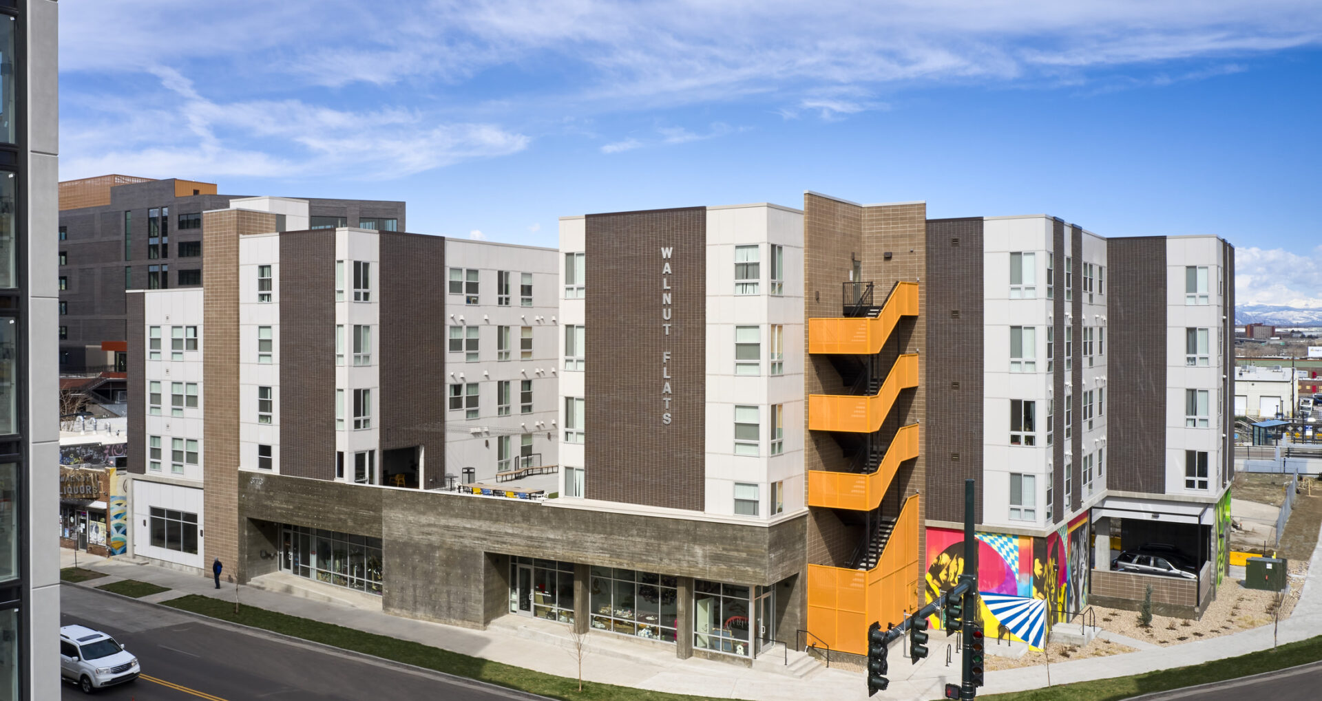 The clean lines of the building with an artistic stair fit the eclectic vibe of Denver’s hippest ‘hood. With community space for nonprofit organizations and artists, a computer lab and rooftop deck, Walnut Flats will give back to the community in multiple ways.