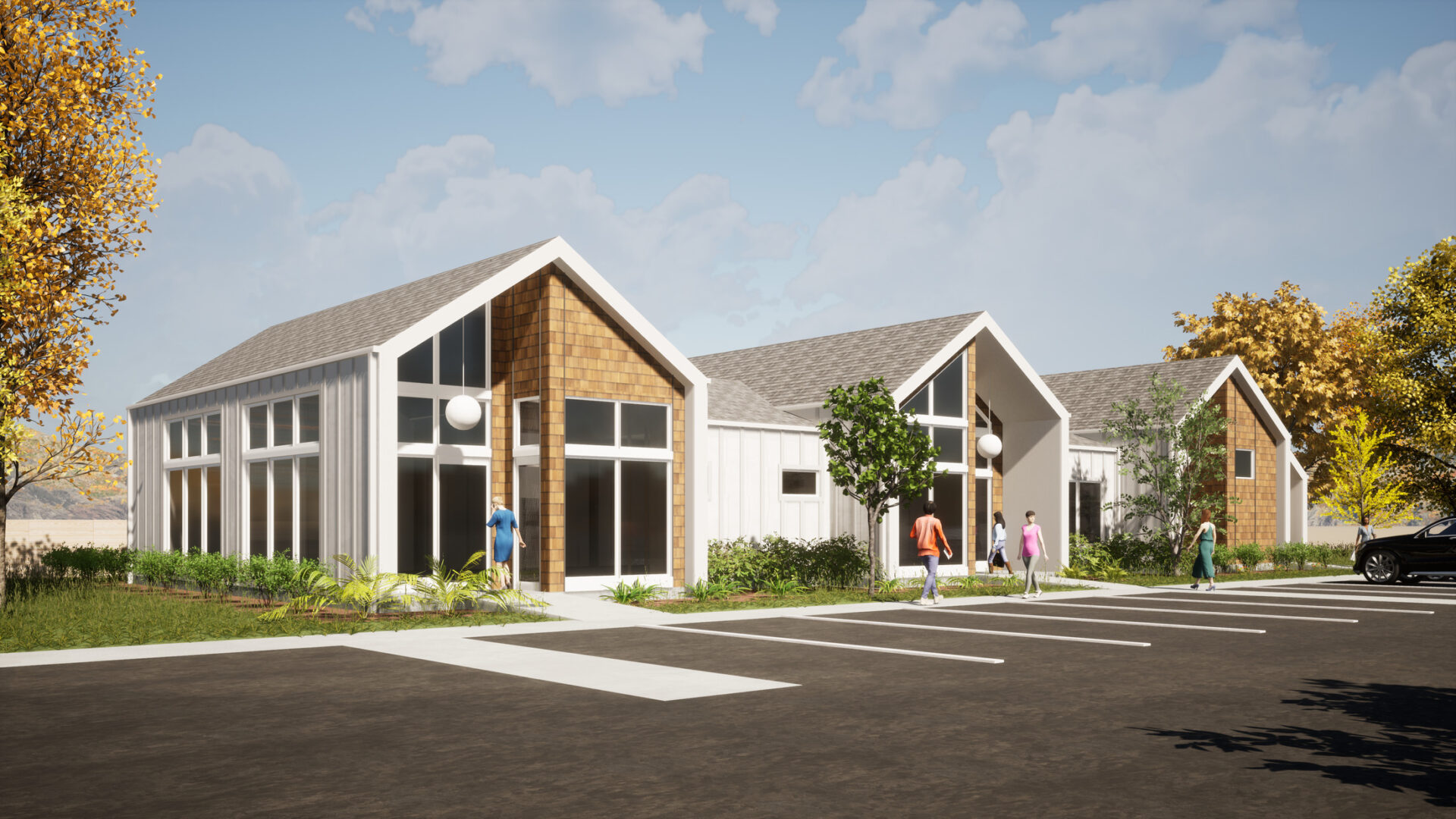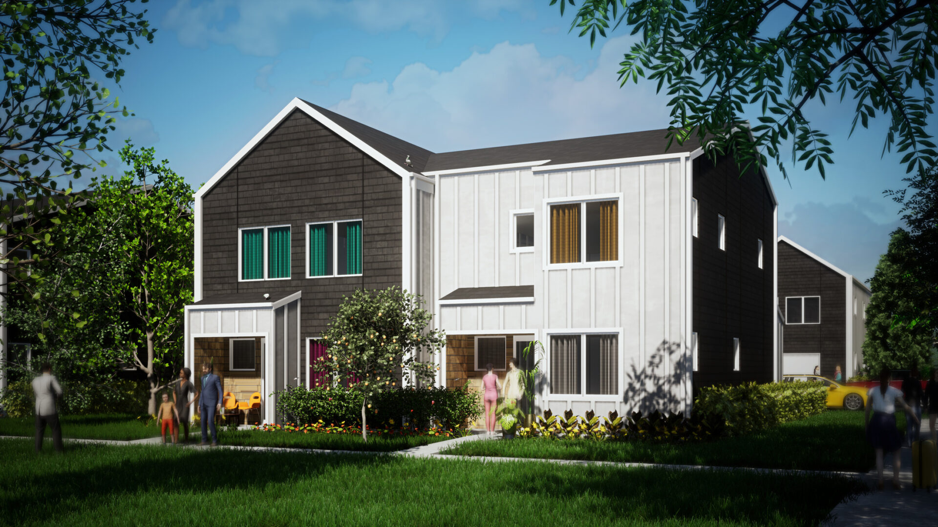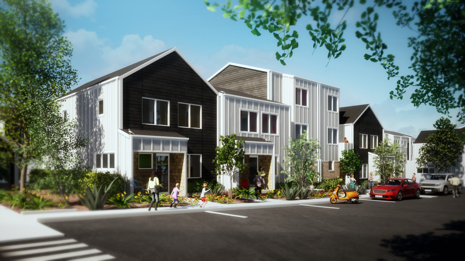 home that can be repeated in a variety of locations from urban infill to suburban greenfield sites without needing to modify the elevational character. With four floor plans that range in size and function from a single-story 2-bedroom to a 3-story 3-bedroom, the plans suit a wide range of demographics and lifestyles. The homes were also strategically designed to be built on their own or attached in multiple combinations to meet market demand.