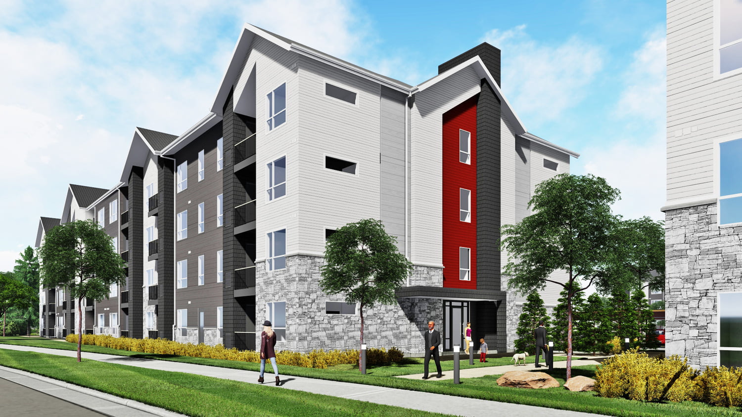 The exterior design draws from local residential vernacular and stresses clean, contemporary detailing. Though comprised of four independent buildings, the project is designed to create connection and community and includes pedestrian walkways and a large, two-story clubhouse designed to bring residents together.